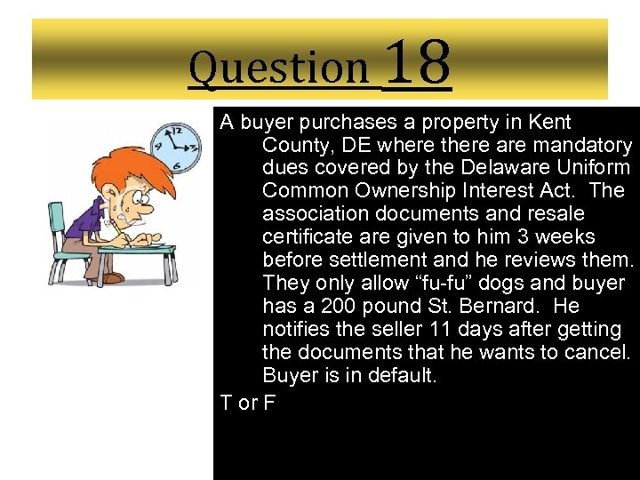 Question 18 A buyer purchases a property in Kent County, DE where there are mandatory dues covered by the Delaware Uniform Common Ownership Interest Act. The association documents and resale certificate are given to him 3 weeks before settlement and he reviews them. They only allow “fu-fu” dogs and buyer has a 200 pound St. Bernard. He notifies the seller 11 days after getting the documents that he wants to cancel. Buyer is in default. T or F