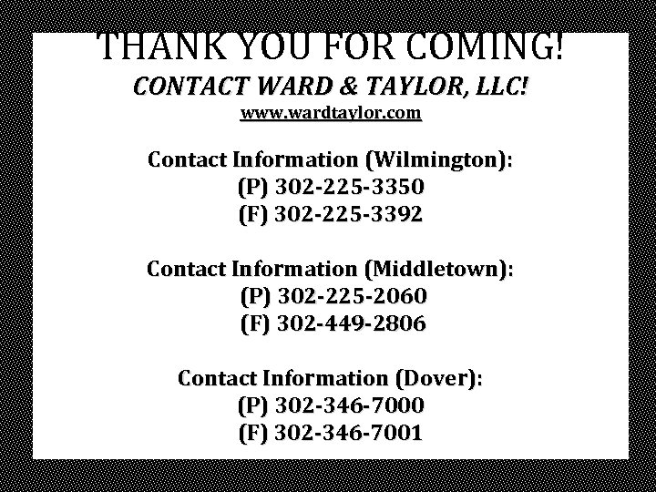 THANK YOU FOR COMING! CONTACT WARD & TAYLOR, LLC! www. wardtaylor. com Contact Information (Wilmington): (P) 302 -225 -3350 (F) 302 -225 -3392 Contact Information (Middletown): (P) 302 -225 -2060 (F) 302 -449 -2806 Contact Information (Dover): (P) 302 -346 -7000 (F) 302 -346 -7001