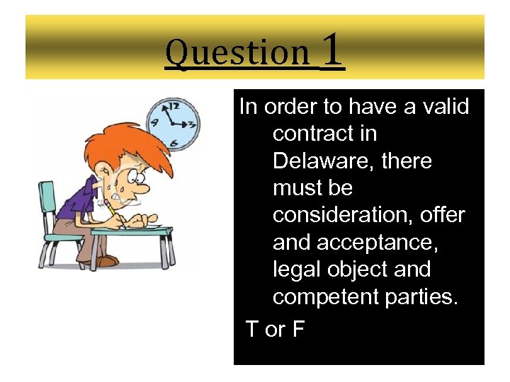 Question 1 In order to have a valid contract in Delaware, there must be consideration, offer and acceptance, legal object and competent parties. T or F