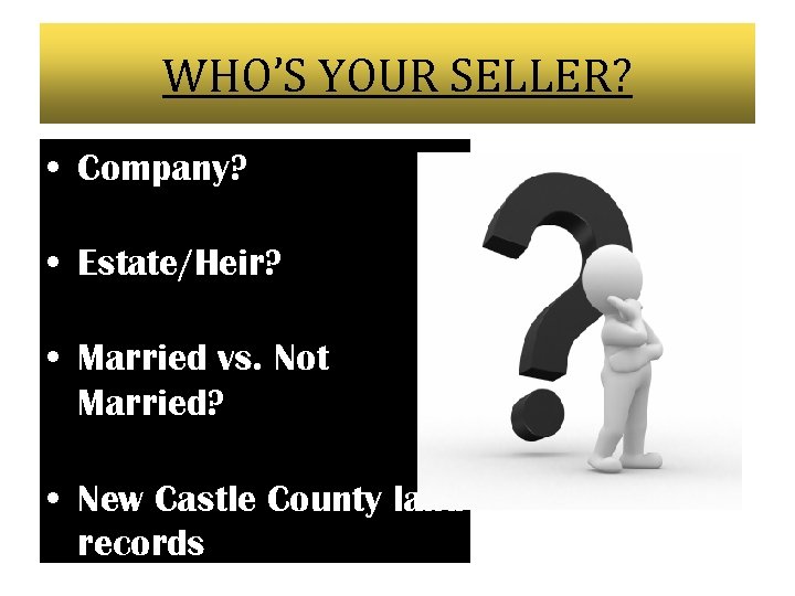 WHO’S YOUR SELLER? • Company? • Estate/Heir? • Married vs. Not Married? • New Castle County land records