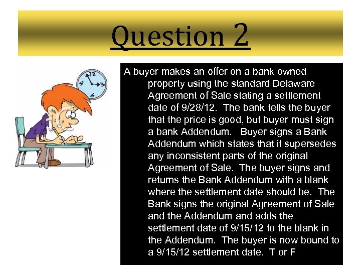 Question 2 A buyer makes an offer on a bank owned property using the standard Delaware Agreement of Sale stating a settlement date of 9/28/12. The bank tells the buyer that the price is good, but buyer must sign a bank Addendum. Buyer signs a Bank Addendum which states that it supersedes any inconsistent parts of the original Agreement of Sale. The buyer signs and returns the Bank Addendum with a blank where the settlement date should be. The Bank signs the original Agreement of Sale and the Addendum and adds the settlement date of 9/15/12 to the blank in the Addendum. The buyer is now bound to a 9/15/12 settlement date. T or F