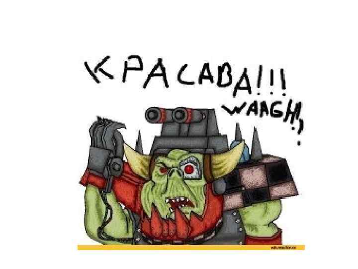 Язык • Орки говорят на искажённом английском, но клыки мешают им правильно произносить слова. Они не могут озвучить букву «h» и окончание «er» . В письменной форме «er» заменяется на «a» . Поэтому, например, «hunter» (охотник) произносится как «unta» , «shooter» (стрелок) как «shoota» и т. д. Кроме этого, орки не могут произнести «th» , и озвучивают это как «f» . Например: «teef» , «fings» , и «fose» вместо «teeth» , «things» , и «those» . Также слова, оканчивающиеся на «s» , орки произносят более жёстко, заменяя «s» на «z» (Slugga Boyz, Grotz, Mad Dokz и т. д. ). В целом речь орков похожа на жаргон афроамериканцев и диалект кокни. • В русской версии компьютерной игры «Warhammer 40, 000: Dawn of War» это переводится как искажённое произношение, похожее на падонкоффский сленг. Однако в русской версии игры «Warhammer 40, 000: Space Marine» орки и гретчины говорят без акцента и искажений речи (да и более цивилизованно).