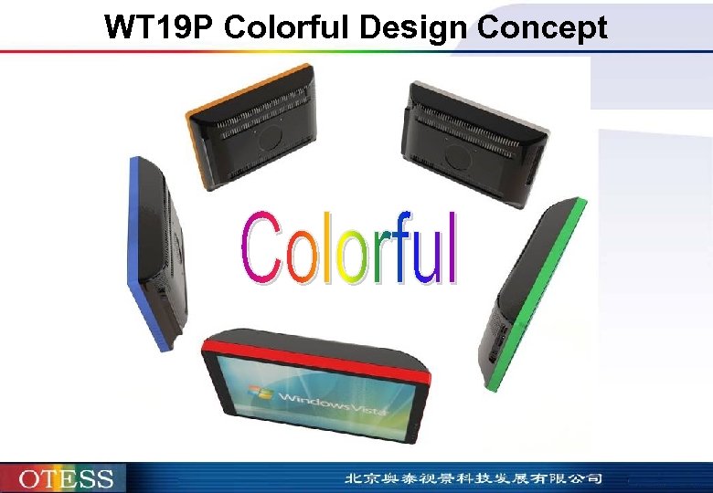 WT 19 P Key Feature n Build in standard VESA Screw Hole. (100 x 100 mm) n Big Panel Size & High Resolution for HD Content. Dual Core CPU Atom 330 performance Support Max Video Bandwidth 15 M/s for 1080/720/480 p. n Hard panel protection and no frame design. n Support dual monitor function. (Internal + External VGA output) n Support monitor function. It can use anyone PC, internal PC + External VGA input for other PC. n AC Adaptor and Cable Management n Expansion Slot (mini Card x 1) n Easy set-up (Portrait or Landscape) / Easy maintenance (Module Design) n Flexible & ergonomic by VESA hole solutions n No vent hole on top side. (prevent some dust from top size) n Slim Bezel and Frame-less n Option Touch Screen KIT.