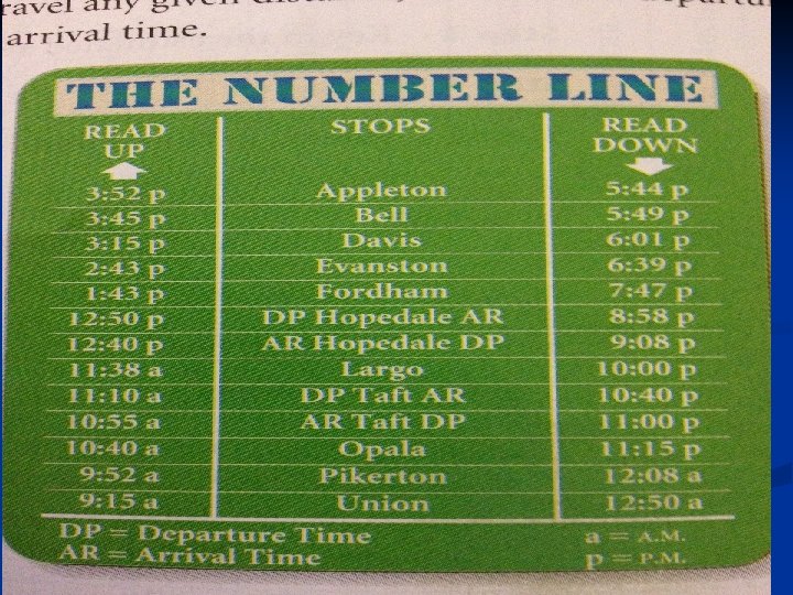 You Do (Reading a bus schedule) n Find the time it takes for each trip 1. 2. 3. 4. Fordham to Hopedale Bell to Fordham Evanston to Largo Union to Evanston