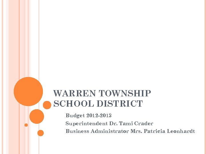 WARREN TOWNSHIP SCHOOL DISTRICT Budget 2012 -2013 Superintendent Dr. Tami Crader Business Administrator Mrs. Patricia Leonhardt