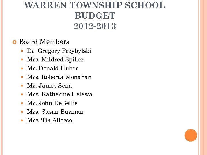 WARREN TOWNSHIP SCHOOL BUDGET 2012 -2013 Board Members Dr. Gregory Przybylski Mrs. Mildred Spiller Mr. Donald Huber Mrs. Roberta Monahan Mr. James Sena Mrs. Katherine Helewa Mr. John De. Bellis Mrs. Susan Burman Mrs. Tia Allocco