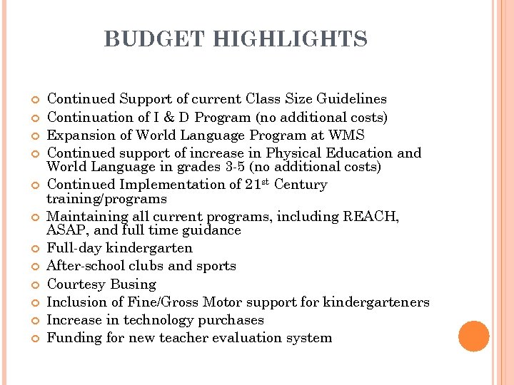 BUDGET HIGHLIGHTS Continued Support of current Class Size Guidelines Continuation of I & D Program (no additional costs) Expansion of World Language Program at WMS Continued support of increase in Physical Education and World Language in grades 3 -5 (no additional costs) Continued Implementation of 21 st Century training/programs Maintaining all current programs, including REACH, ASAP, and full time guidance Full-day kindergarten After-school clubs and sports Courtesy Busing Inclusion of Fine/Gross Motor support for kindergarteners Increase in technology purchases Funding for new teacher evaluation system