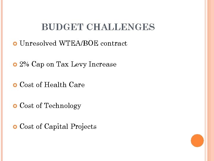 BUDGET CHALLENGES Unresolved WTEA/BOE contract 2% Cap on Tax Levy Increase Cost of Health Care Cost of Technology Cost of Capital Projects
