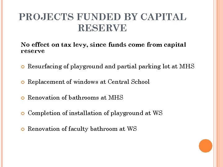PROJECTS FUNDED BY CAPITAL RESERVE No effect on tax levy, since funds come from capital reserve Resurfacing of playground and partial parking lot at MHS Replacement of windows at Central School Renovation of bathrooms at MHS Completion of installation of playground at WS Renovation of faculty bathroom at WS