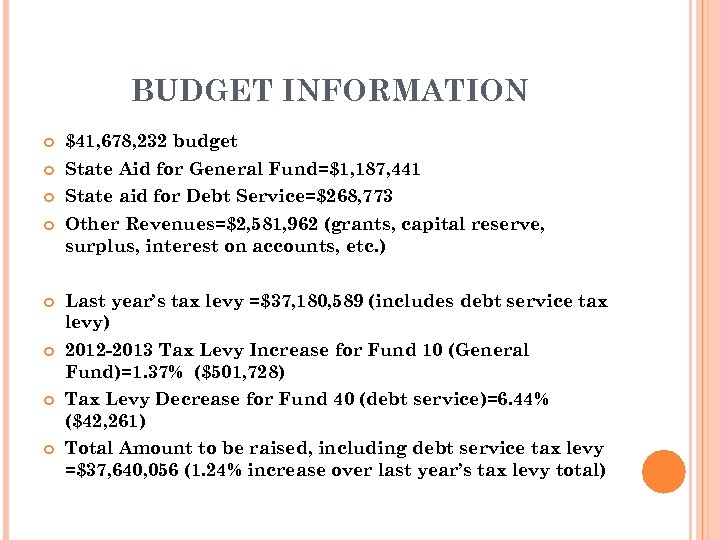 BUDGET INFORMATION $41, 678, 232 budget State Aid for General Fund=$1, 187, 441 State aid for Debt Service=$268, 773 Other Revenues=$2, 581, 962 (grants, capital reserve, surplus, interest on accounts, etc. ) Last year’s tax levy =$37, 180, 589 (includes debt service tax levy) 2012 -2013 Tax Levy Increase for Fund 10 (General Fund)=1. 37% ($501, 728) Tax Levy Decrease for Fund 40 (debt service)=6. 44% ($42, 261) Total Amount to be raised, including debt service tax levy =$37, 640, 056 (1. 24% increase over last year’s tax levy total)