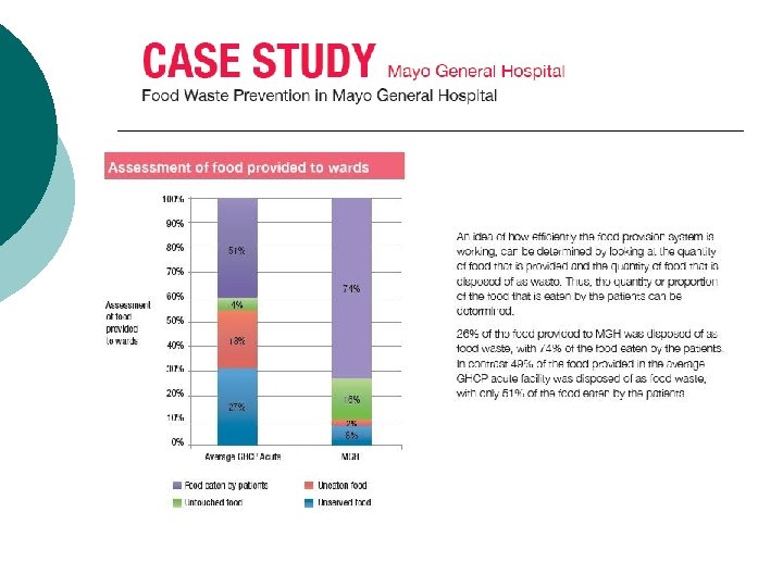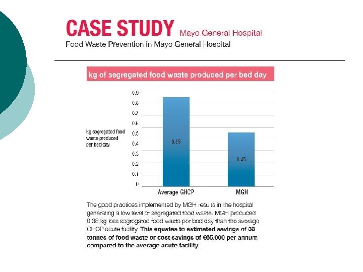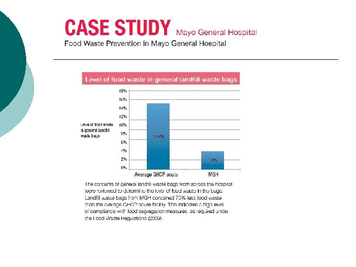 Case Study 1 - retail ¡ ¡ ¡ - Large supermarket; daily customer base 3, 200; floor area 2, 000 m 2; staff 120; retailing large variety of goods including delicatessen, butcher, grocery and offlicence. 244 tonne per annum reduced to 181 tonne- equates to reduction from. 17 kg of waste arising per footfall to. 13 kg. Achieved through: Improved waste segregation; Removal of compactor and replaced with receptacles for recyclables and landfill waste; Improved efficiencies through preparation of food; More efficient use of balers Delivery containers returned for reuse Education and awareness.