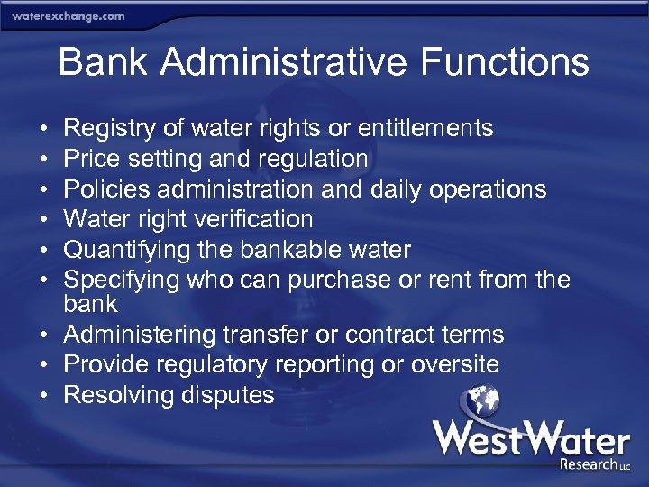 Bank Administrative Functions • • • Registry of water rights or entitlements Price setting and regulation Policies administration and daily operations Water right verification Quantifying the bankable water Specifying who can purchase or rent from the bank • Administering transfer or contract terms • Provide regulatory reporting or oversite • Resolving disputes