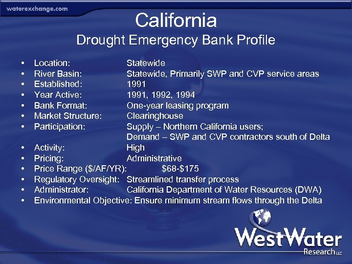State Arizona Initial Bank Activity 1996 California 1991 & 2001 Colorado 2002 Idaho 1932 & 1979 Montana - Nevada 2000 & 2002 New Mexico 2002 Oregon 2003 Texas Utah Washington Wyoming 1993 & 2001 - Water Banks in the West