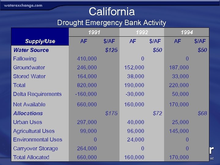 California Drought Emergency Bank Activity 1991 Supply/Use Water Source AF 1992 $/AF AF 1994 $/AF $125 AF $/AF $50 Fallowing 410, 000 Groundwater 246, 000 152, 000 187, 000 Stored Water 164, 000 38, 000 33, 000 Total 820, 000 190, 000 220, 000 -160, 000 -30, 000 50, 000 660, 000 170, 000 Delta Requirements Net Available Allocations Urban Uses Agricultural Uses 0 $50 $175 297, 000 0 $72 40, 000 $68 25, 000 99, 000 96, 000 145, 000 0 24, 000 0 Carryover Storage 264, 000 0 0 Total Allocated 660, 000 Environmental Uses 160, 000 170, 000