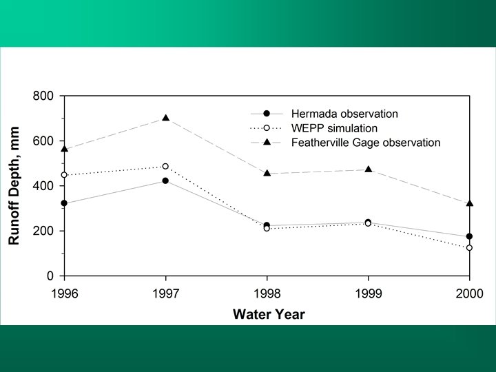Summary § Numerous modifications have been incorporated into WEPP v 2006. 5 § Specifically, changes were made in the approach to, and algorithms for modeling deep percolation of soil water and subsurface lateral flow § The refined model has the ability to more properly partition infiltration water between deep percolation and subsurface lateral flow § For the Hermada forest watershed Vegetation growth and ground cover were described realistically WEPP-simulated annual watershed discharge was compatible with field observation; and predicted annual sediment yield was not significantly different from the observed Nash-Sutcliffe model efficiency coefficient for daily runoff of − 0. 77 suggests further improvement on winter routines are needed