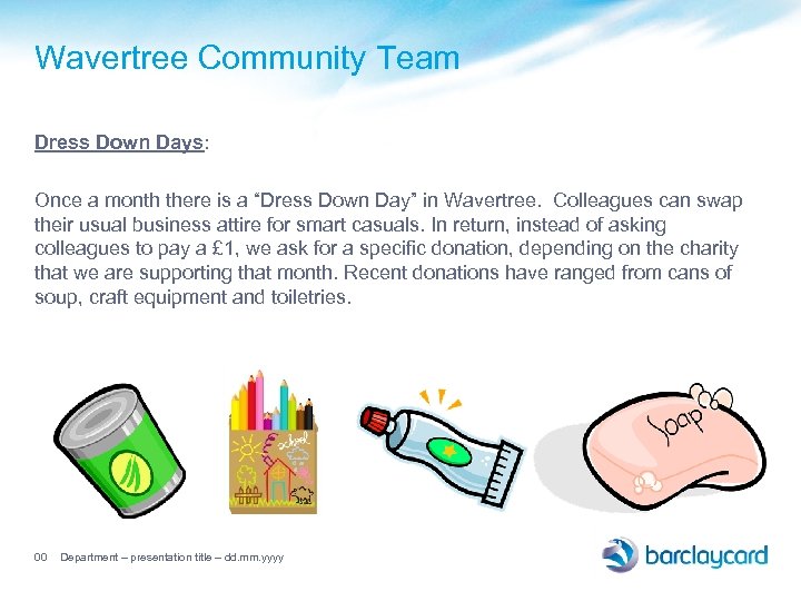 Wavertree Community Team Dress Down Days: Once a month there is a “Dress Down Day” in Wavertree. Colleagues can swap their usual business attire for smart casuals. In return, instead of asking colleagues to pay a £ 1, we ask for a specific donation, depending on the charity that we are supporting that month. Recent donations have ranged from cans of soup, craft equipment and toiletries. 00 Department – presentation title – dd. mm. yyyy