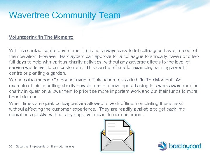 Wavertree Community Team Volunteering/In The Moment: Within a contact centre environment, it is not always easy to let colleagues have time out of the operation. However, Barclaycard can approve for a colleague to annually have up to two full days to help with various charity activities, without any adverse effects to the level of service we deliver to our customers. This can be off site for example, painting a youth centre or planting a garden. We can also manage “in house” events. This scheme is called ‘In The Moment’. An example of this is putting charity newsletters into envelopes. Taking this work away from the charity in question allows them to prioritise more important work and put their funds to more beneficial use. When times are quiet, colleagues are allowed to work offline, completing these tasks without affecting the customer experience. They are readily available to get back into operations quickly, without any negative impact to our customers. 00 Department – presentation title – dd. mm. yyyy