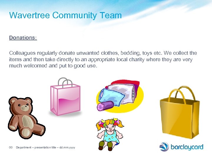Wavertree Community Team Donations: Colleagues regularly donate unwanted clothes, bedding, toys etc. We collect the items and then take directly to an appropriate local charity where they are very much welcomed and put to good use. 00 Department – presentation title – dd. mm. yyyy