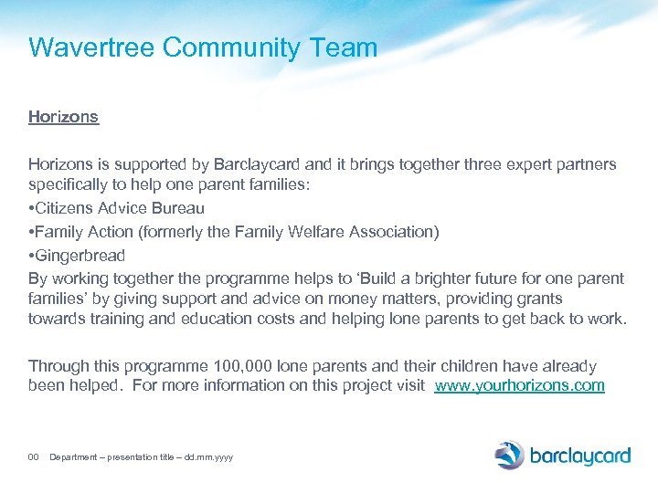 Wavertree Community Team Horizons is supported by Barclaycard and it brings together three expert partners specifically to help one parent families: • Citizens Advice Bureau • Family Action (formerly the Family Welfare Association) • Gingerbread By working together the programme helps to ‘Build a brighter future for one parent families’ by giving support and advice on money matters, providing grants towards training and education costs and helping lone parents to get back to work. Through this programme 100, 000 lone parents and their children have already been helped. For more information on this project visit www. yourhorizons. com 00 Department – presentation title – dd. mm. yyyy