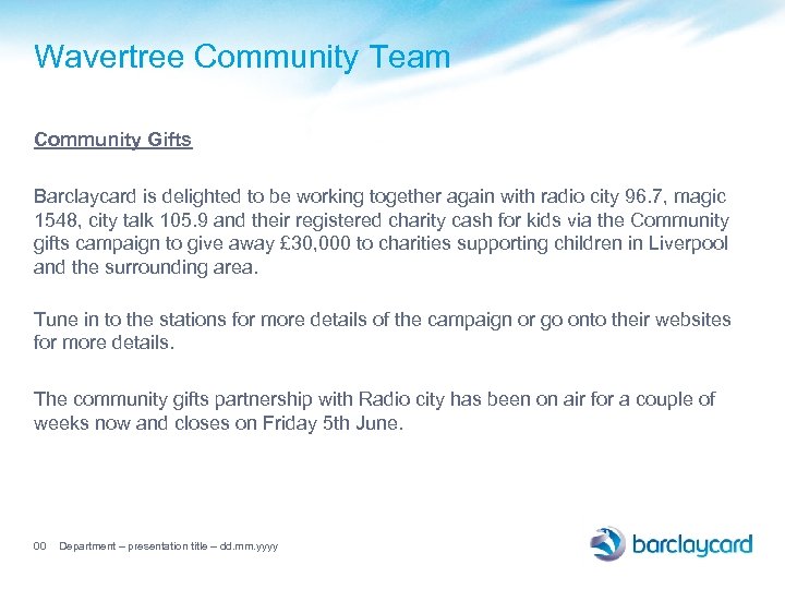 Wavertree Community Team Community Gifts Barclaycard is delighted to be working together again with radio city 96. 7, magic 1548, city talk 105. 9 and their registered charity cash for kids via the Community gifts campaign to give away £ 30, 000 to charities supporting children in Liverpool and the surrounding area. Tune in to the stations for more details of the campaign or go onto their websites for more details. The community gifts partnership with Radio city has been on air for a couple of weeks now and closes on Friday 5 th June. 00 Department – presentation title – dd. mm. yyyy