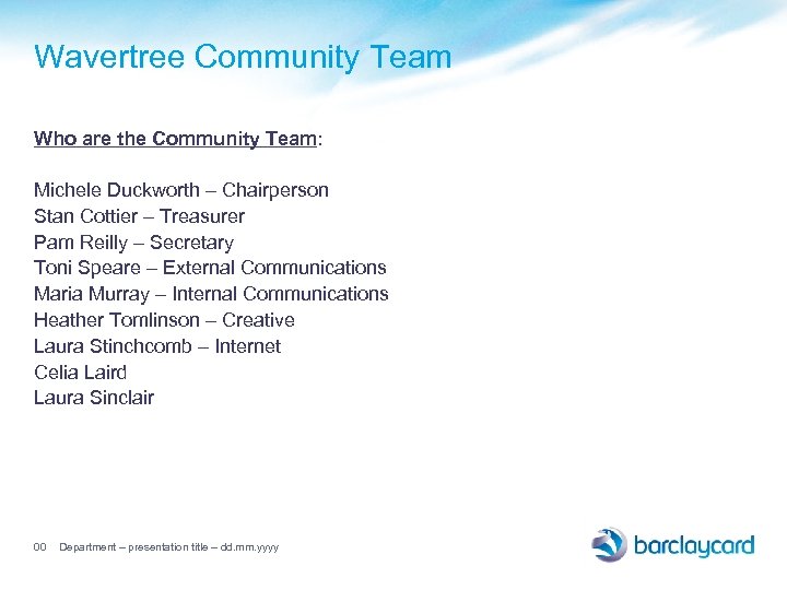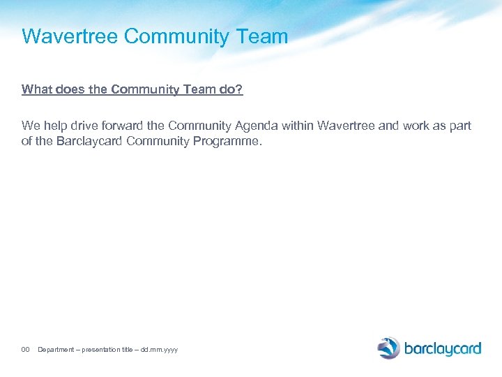 Wavertree Community Team What does the Community Team do? We help drive forward the Community Agenda within Wavertree and work as part of the Barclaycard Community Programme. 00 Department – presentation title – dd. mm. yyyy