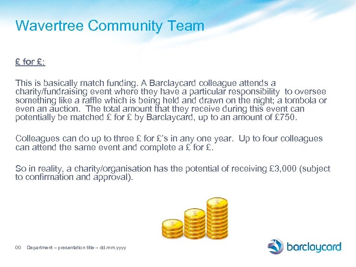 Wavertree Community Team £ for £: This is basically match funding. A Barclaycard colleague attends a charity/fundraising event where they have a particular responsibility to oversee something like a raffle which is being held and drawn on the night; a tombola or even an auction. The total amount that they receive during this event can potentially be matched £ for £ by Barclaycard, up to an amount of £ 750. Colleagues can do up to three £ for £’s in any one year. Up to four colleagues can attend the same event and complete a £ for £. So in reality, a charity/organisation has the potential of receiving £ 3, 000 (subject to confirmation and approval). 00 Department – presentation title – dd. mm. yyyy