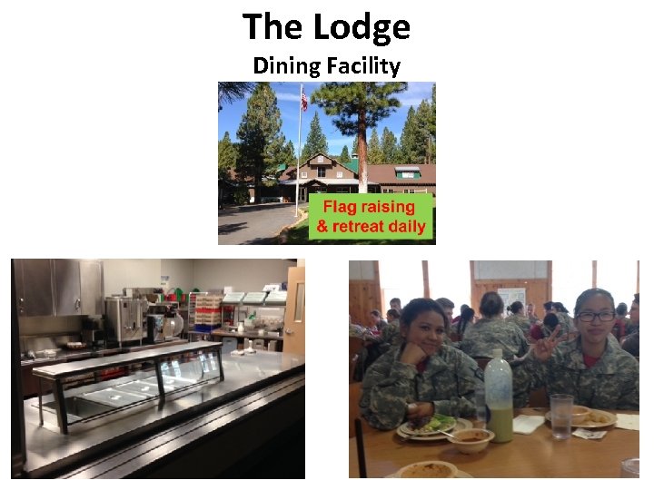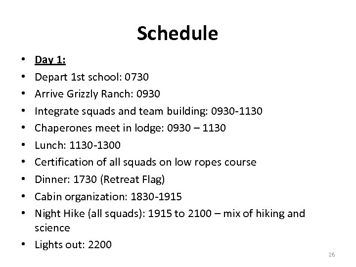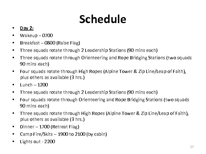 Schedule Day 1: Depart 1 st school: 0730 Arrive Grizzly Ranch: 0930 Integrate squads and team building: 0930 -1130 Chaperones meet in lodge: 0930 – 1130 Lunch: 1130 -1300 Certification of all squads on low ropes course Dinner: 1730 (Retreat Flag) Cabin organization: 1830 -1915 Night Hike (all squads): 1915 to 2100 – mix of hiking and science • Lights out: 2200 • • • 26