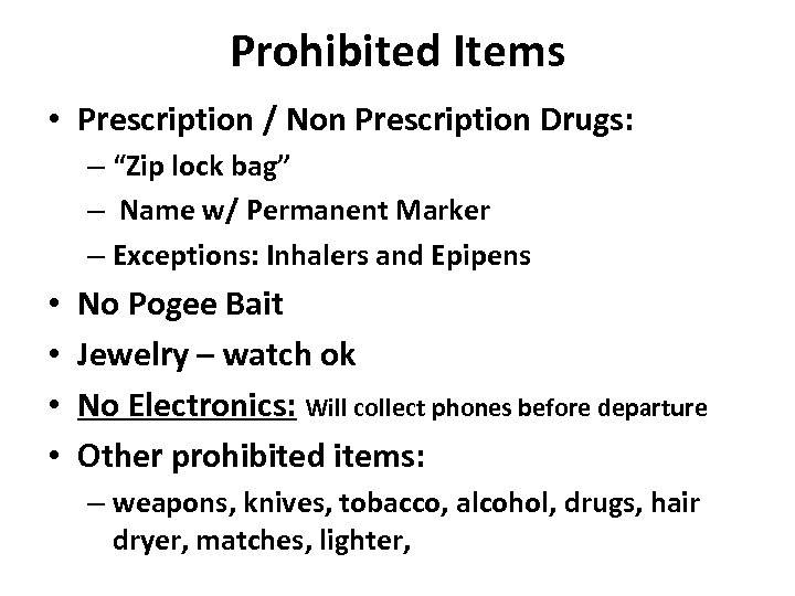 Prohibited Items • Prescription / Non Prescription Drugs: – “Zip lock bag” – Name w/ Permanent Marker – Exceptions: Inhalers and Epipens • • No Pogee Bait Jewelry – watch ok No Electronics: Will collect phones before departure Other prohibited items: – weapons, knives, tobacco, alcohol, drugs, hair dryer, matches, lighter,