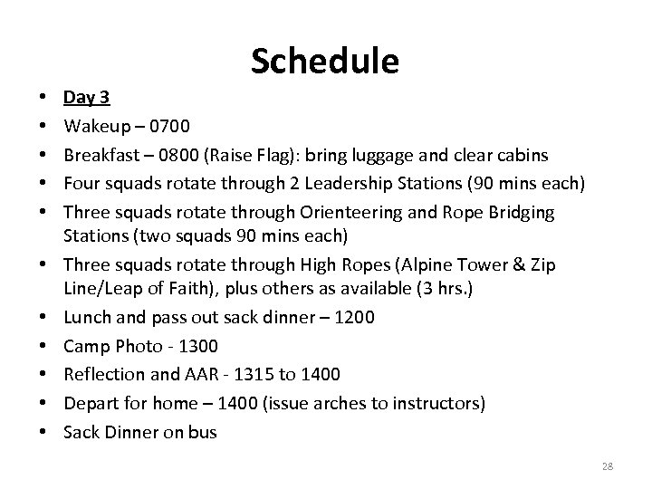 • • • • Schedule Day 2: Wakeup – 0700 Breakfast – 0800 (Raise Flag) Three squads rotate through 2 Leadership Stations (90 mins each) Three squads rotate through Orienteering and Rope Bridging Stations (two squads 90 mins each) Four squads rotate through High Ropes (Alpine Tower & Zip Line/Leap of Faith), plus others as available (3 hrs. ) Lunch – 1200 Three squads rotate through 2 Leadership Stations (90 mins each) Four squads rotate through Orienteering and Rope Bridging Stations (two squads 90 mins each) Three squads rotate through High Ropes (Alpine Tower & Zip Line/Leap of Faith), plus others as available (3 hrs. ) Dinner – 1700 (Retreat Flag) Camp Fire/Skits – 1900 to 2100 (by cabin) Lights out - 2200 27