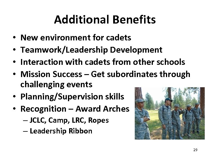 Additional Benefits New environment for cadets Teamwork/Leadership Development Interaction with cadets from other schools Mission Success – Get subordinates through challenging events • Planning/Supervision skills • Recognition – Award Arches • • – JCLC, Camp, LRC, Ropes – Leadership Ribbon 29