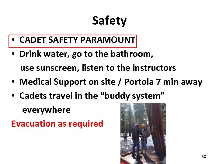 Safety • CADET SAFETY PARAMOUNT • Drink water, go to the bathroom, use sunscreen, listen to the instructors • Medical Support on site / Portola 7 min away • Cadets travel in the “buddy system” everywhere Evacuation as required 30