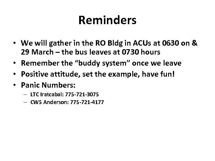 Reminders • We will gather in the RO Bldg in ACUs at 0630 on & 29 March – the bus leaves at 0730 hours • Remember the “buddy system” once we leave • Positive attitude, set the example, have fun! • Panic Numbers: – LTC Iratcabal: 775 -721 -3075 – CW 5 Anderson: 775 -721 -4177