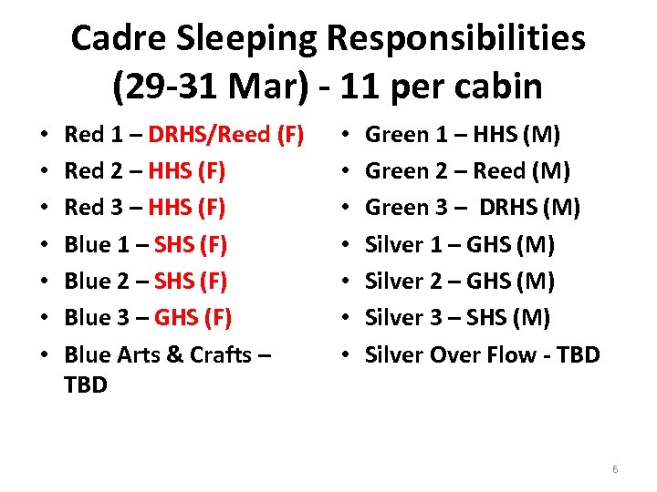 Cadre Sleeping Responsibilities (29 -31 Mar) - 11 per cabin • • Red 1 – DRHS/Reed (F) Red 2 – HHS (F) Red 3 – HHS (F) Blue 1 – SHS (F) Blue 2 – SHS (F) Blue 3 – GHS (F) Blue Arts & Crafts – TBD • • Green 1 – HHS (M) Green 2 – Reed (M) Green 3 – DRHS (M) Silver 1 – GHS (M) Silver 2 – GHS (M) Silver 3 – SHS (M) Silver Over Flow - TBD 6