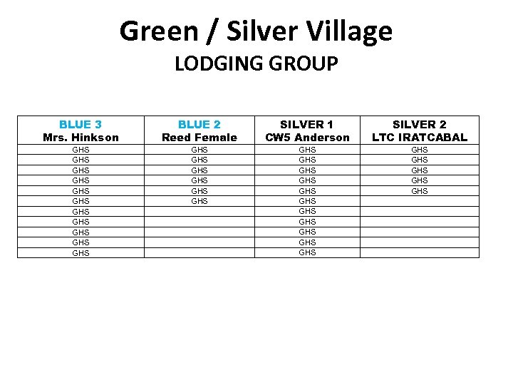 Green / Silver Village LODGING GROUP BLUE 3 Mrs. Hinkson BLUE 2 Reed Female SILVER 1 CW 5 Anderson SILVER 2 LTC IRATCABAL GHS GHS GHS GHS GHS GHS GHS GHS GHS