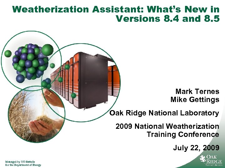Weatherization Assistant: What’s New in Versions 8. 4 and 8. 5 Mark Ternes Mike Gettings Oak Ridge National Laboratory 2009 National Weatherization Training Conference July 22, 2009 Managed by UT-Battelle for the Department of Energy