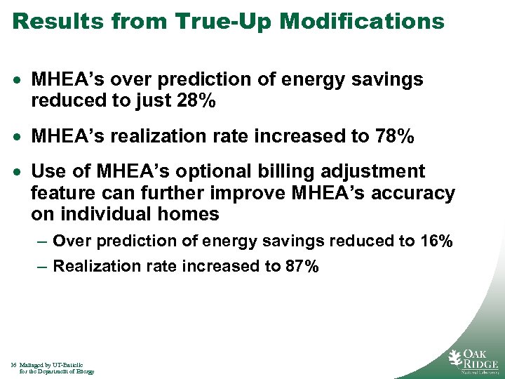 Results from True-Up Modifications · MHEA’s over prediction of energy savings reduced to just 28% · MHEA’s realization rate increased to 78% · Use of MHEA’s optional billing adjustment feature can further improve MHEA’s accuracy on individual homes – Over prediction of energy savings reduced to 16% – Realization rate increased to 87% 16 Managed by UT-Battelle for the Department of Energy