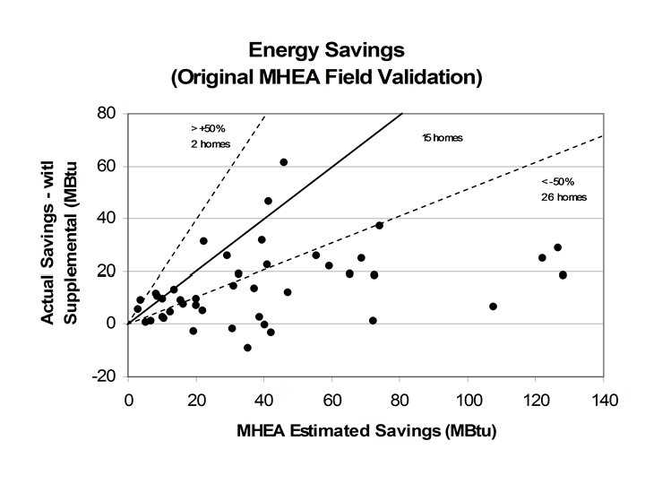 MHEA Field Validation Study · Validation performed at DOE request before full implementation of MHEA · Validation report published November 2007 (ORNL/CON-501) · Findings (86 homes) – MHEA over predicted space -heating energy savings of weatherization measures by ~200% on average per home – MHEA achieved an average realization rate of ~35% (actual savings divided by predicted savings) 3 Managed by UT-Battelle for the Department of Energy