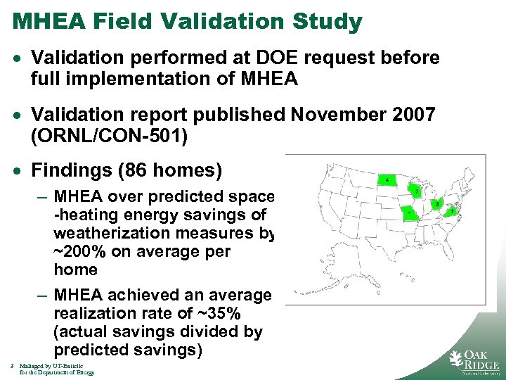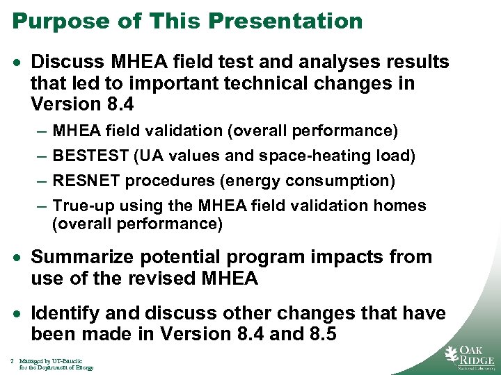 Purpose of This Presentation · Discuss MHEA field test and analyses results that led to important technical changes in Version 8. 4 – – MHEA field validation (overall performance) BESTEST (UA values and space-heating load) RESNET procedures (energy consumption) True-up using the MHEA field validation homes (overall performance) · Summarize potential program impacts from use of the revised MHEA · Identify and discuss other changes that have been made in Version 8. 4 and 8. 5 2 Managed by UT-Battelle for the Department of Energy