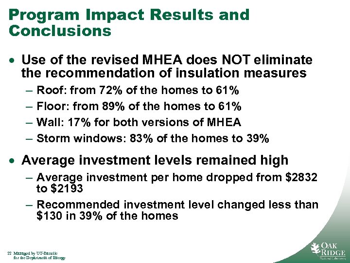 Simulation of Program Impacts from Use of the Revised MHEA · Compared recommendations from the revised MHEA (Version 8. 4) to the original (Version 8. 3) – Frequency that measures are recommended – Average investment levels per home · 18 mobile homes in Ohio – 13 heated by natural gas – 5 electrically heated · Columbus weather (5723 HDD) · State-supplied fuel and installation costs · Included health & safety and repair items 21 Managed by UT-Battelle for the Department of Energy