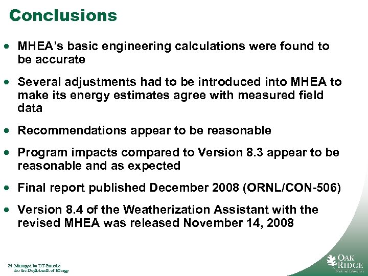 Conclusions · MHEA’s basic engineering calculations were found to be accurate · Several adjustments had to be introduced into MHEA to make its energy estimates agree with measured field data · Recommendations appear to be reasonable · Program impacts compared to Version 8. 3 appear to be reasonable and as expected · Final report published December 2008 (ORNL/CON-506) · Version 8. 4 of the Weatherization Assistant with the revised MHEA was released November 14, 2008 24 Managed by UT-Battelle for the Department of Energy