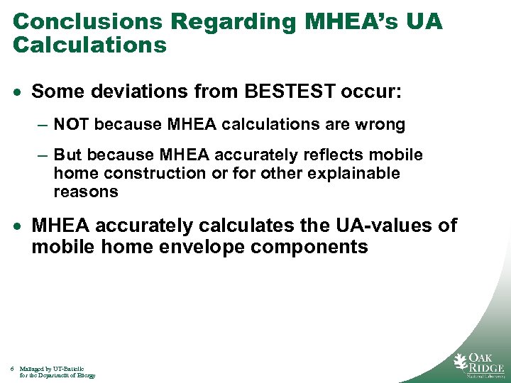 Conclusions Regarding MHEA’s UA Calculations · Some deviations from BESTEST occur: – NOT because MHEA calculations are wrong – But because MHEA accurately reflects mobile home construction or for other explainable reasons · MHEA accurately calculates the UA-values of mobile home envelope components 6 Managed by UT-Battelle for the Department of Energy