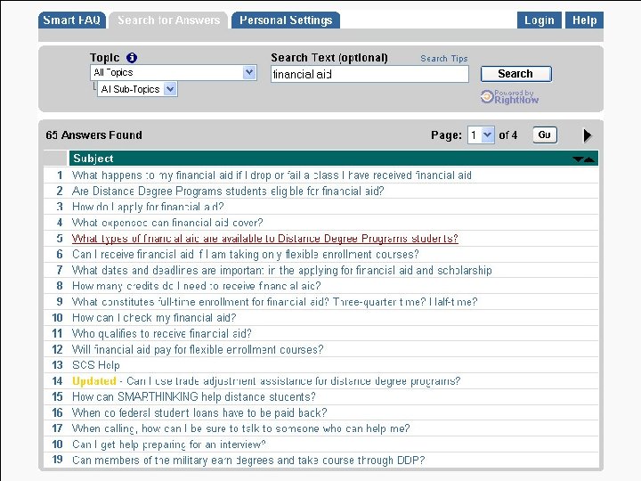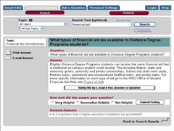 Advising: High Tech and High Touch • City University of New York – Synchronous chat program links students and advisors. – Electronic transcript of discussion sent to the student and stored for reference. – If “caller” is a current student the system draws name and info from SIS – If “caller” is an inquiring student a short form is completed before connection asking for name and email address.