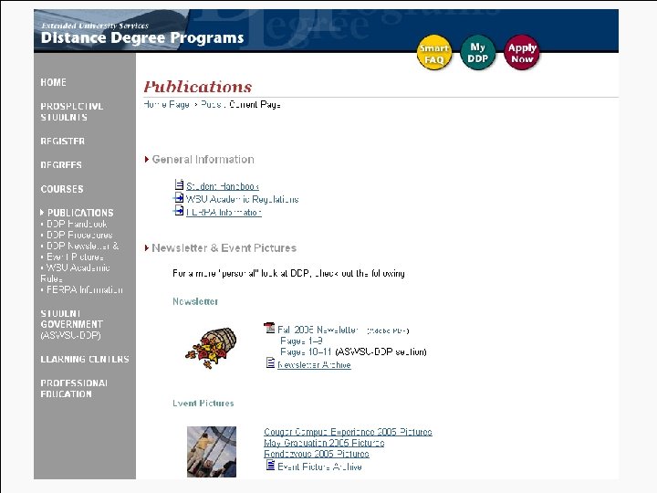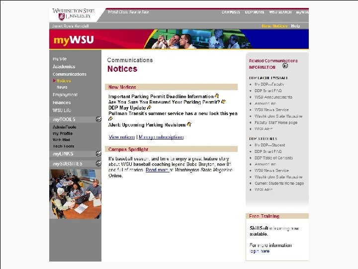 Evolution of Web Services Four Distinct Generations: Organization of Information üGeneration I - Institutional View üGeneration II - Customer Group View üGeneration III - Web Portal(s)/Individual View üGeneration IV - High Touch & High Tech (inside/outside portal) Source: Creating High Touch / High Tech Online Student Services: Darlene Burnett, 2003