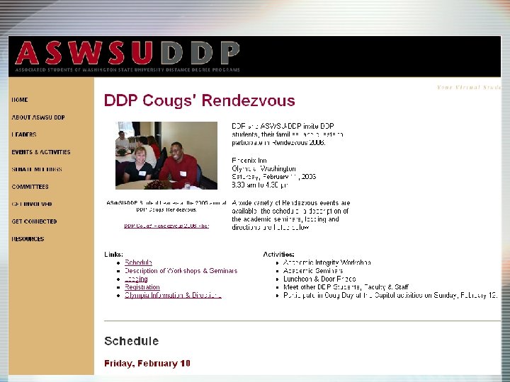 Example Critical Component: As a student, I can make an appointment with an academic advisor üGeneration 0: Cannot find information or services on the Web üGeneration 1: Student can find office location/telephone for scheduling an appointment üGeneration 2: Student can email advisor for appointment üGeneration 3: Student can view advisor’s calendar online and select appointment üGeneration 4: Student can use his calendar as a filter against advisor’s calendar to find appointment; Can request reminder to be sent 24 hours in advance with appropriate preparation material Pat Shea & Darlene Burnett, 2006. All rights reserved.