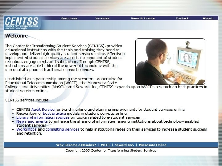CENTSS Center for Transforming Student Services ü Developed by the Western Cooperative for Educational Telecommunications (WCET), the Minnesota State Colleges and Universities (Mn. SCU), and Seward, Inc. ü Provides tools and training institutions need to develop and deliver high-quality student services online centss. org