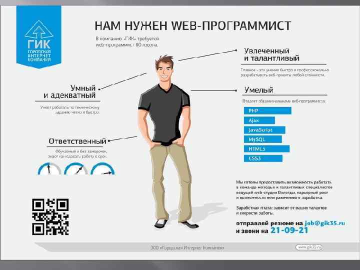 Личные качества: Для web-программиста важна усидчивость, особенно на начальных стадиях карьеры. К сожалению и в этой работе приходится много времени уделять текучке. Если раньше разработчики сайтов практически никогда к ним не возвращались, то сегодня технологии изменились. Готовому сайту постоянно требуется обслуживание, обновления и изменения. Создание web-сайта это процесс работы нескольких специалистов. Поэтому еще одним хорошим качеством для web-программиста будет умение работать в команде. Сколько получает web-программист? Успешный начинающий программист в будущем может претендовать на должности: руководитель группы программистов, менеджер проекта, ИТ-директор.