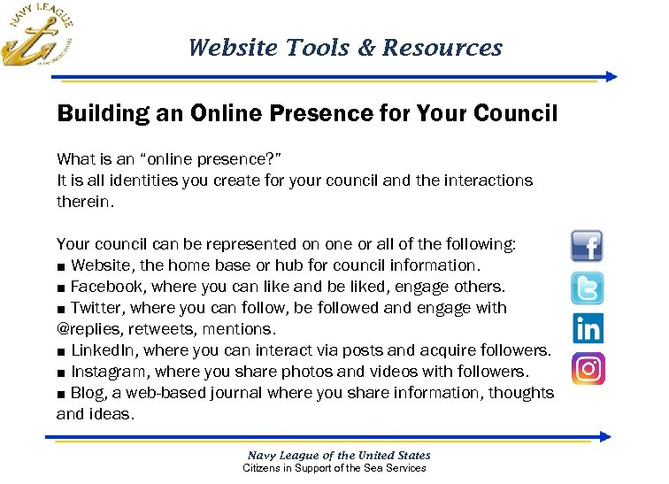 Website Tools & Resources Building an Online Presence for Your Council What is an “online presence? ” It is all identities you create for your council and the interactions therein. Your council can be represented on one or all of the following: ■ Website, the home base or hub for council information. ■ Facebook, where you can like and be liked, engage others. ■ Twitter, where you can follow, be followed and engage with @replies, retweets, mentions. ■ Linked. In, where you can interact via posts and acquire followers. ■ Instagram, where you share photos and videos with followers. ■ Blog, a web-based journal where you share information, thoughts and ideas. Navy League of the United States Citizens in Support of the Sea Services
