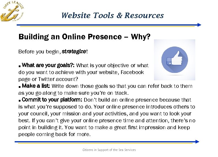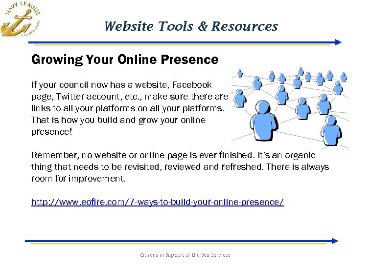 Website Tools & Resources Growing Your Online Presence If your council now has a website, Facebook page, Twitter account, etc. , make sure there are links to all your platforms on all your platforms. That is how you build and grow your online presence! Remember, no website or online page is ever finished. It’s an organic thing that needs to be revisited, reviewed and refreshed. There is always room for improvement. http: //www. eofire. com/7 -ways-to-build-your-online-presence/ Citizens in Support of the Sea Services