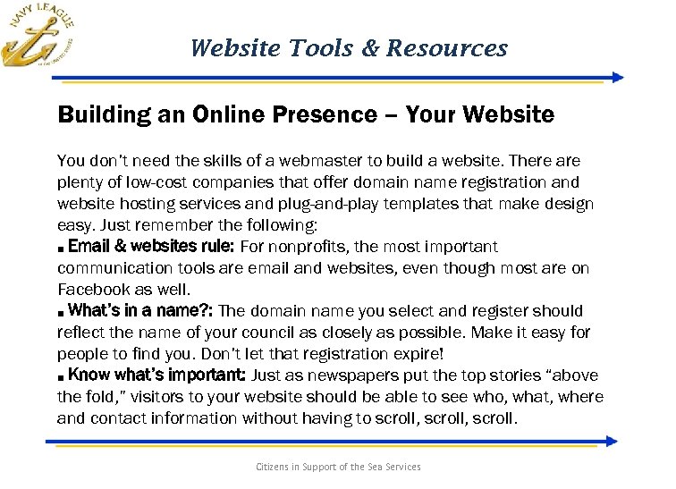 Website Tools & Resources Building an Online Presence – Your Website You don’t need the skills of a webmaster to build a website. There are plenty of low-cost companies that offer domain name registration and website hosting services and plug-and-play templates that make design easy. Just remember the following: ■ Email & websites rule: For nonprofits, the most important communication tools are email and websites, even though most are on Facebook as well. ■ What’s in a name? : The domain name you select and register should reflect the name of your council as closely as possible. Make it easy for people to find you. Don’t let that registration expire! ■ Know what’s important: Just as newspapers put the top stories “above the fold, ” visitors to your website should be able to see who, what, where and contact information without having to scroll, scroll. Citizens in Support of the Sea Services