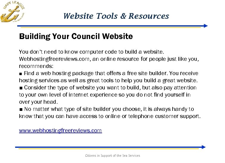 Website Tools & Resources Building Your Council Website You don’t need to know computer code to build a website. Webhostingfreereviews. com, an online resource for people just like you, recommends: ■ Find a web hosting package that offers a free site builder. You receive hosting services as well as great tools to help you build a great website. ■ Consider the type of website you want to build, but also pay attention to your own level of internet experience so you do not find yourself in over your head. ■ No matter what type of site builder you choose, it is always handy to know that you can have access to online or telephone customer support. www. webhostingfreereviews. com Citizens in Support of the Sea Services